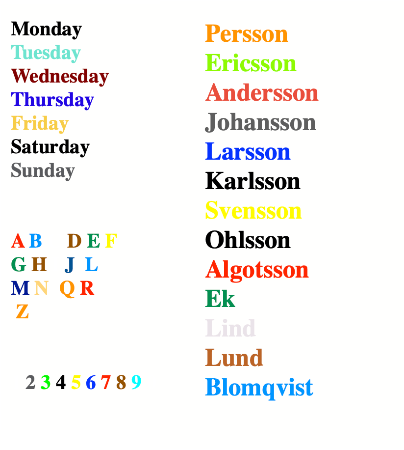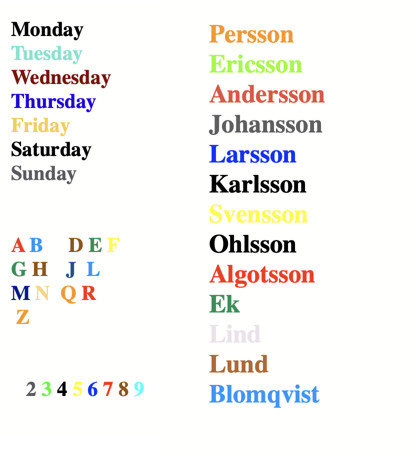 You can see how my synesthesia behaves. In the figure below, all the days of the week, a choice of names, and finally letters and numbers. What color associations do the words have with letters and numbers linked to dates, e.g., presented below.