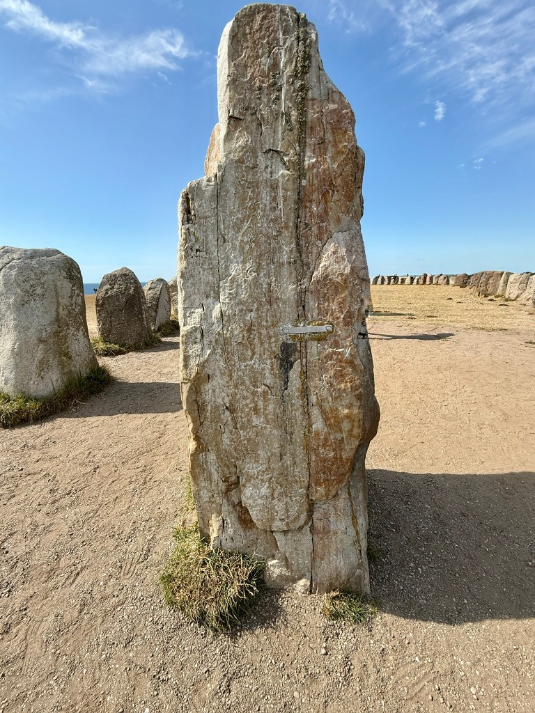 What are Ales stenar, then? It’s a ship setting comprising 59 stones, each weighing approximately 5 tons. The formation measures approximately 67 meters in length and 19 meters in width, making it Sweden’s largest preserved ship setting. The stones date back to the Vendel period (around 540–790 AD). They are made of granite and sandstone. At the front, there is a prominent white quartzite stone. Despite the absence of a grave, its purpose remains uncertain, but it is widely regarded as a grave monument.