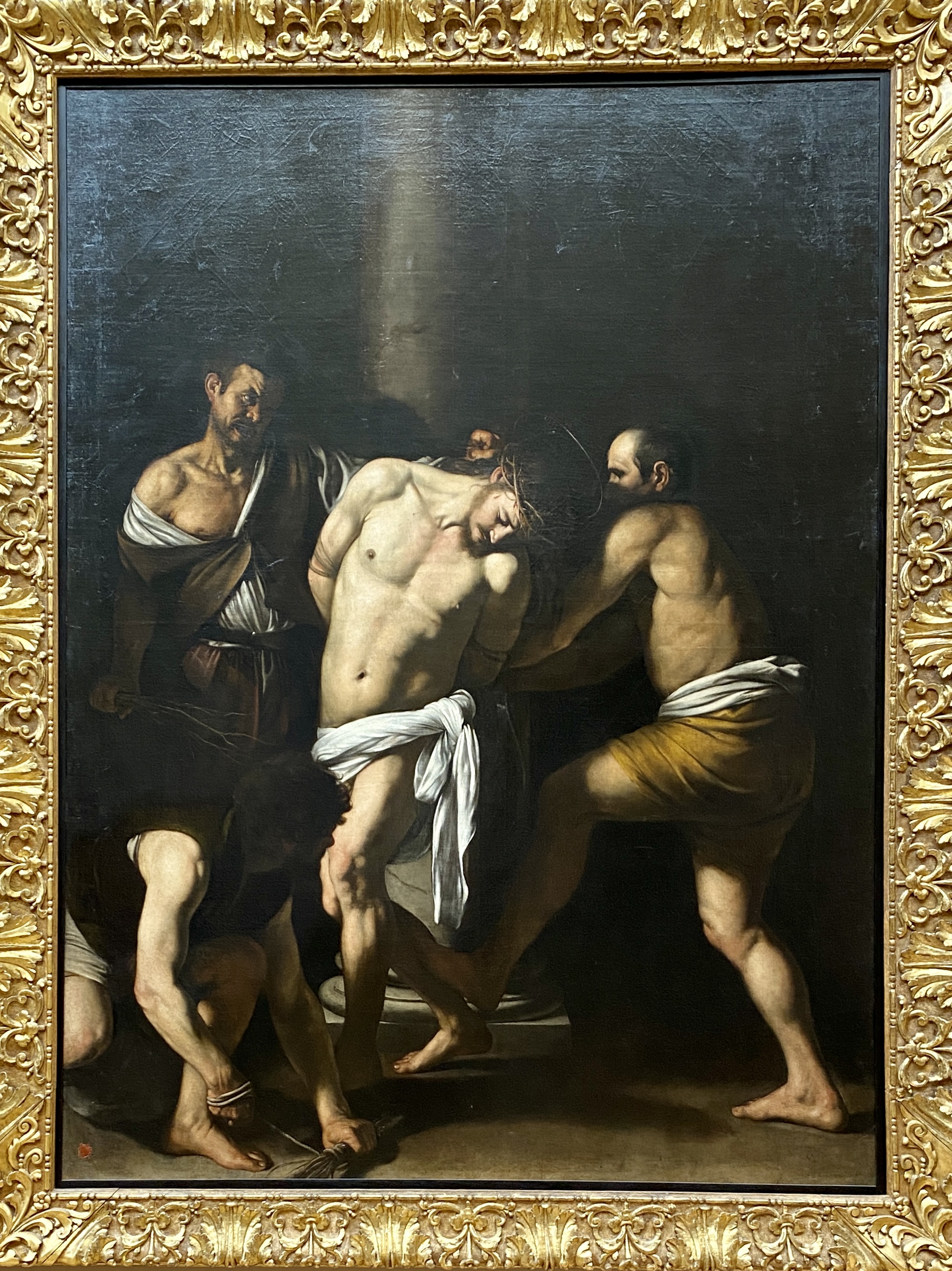The meaning: the moment when Christ is bound to a pillar and scourged by three executioners. The light — the divine — falls mercilessly upon Christ’s body, almost like a spotlight. The composition is tight. The intensity is physical. All superfluous symbols or background details have been removed. The focus is entirely on the human drama.
