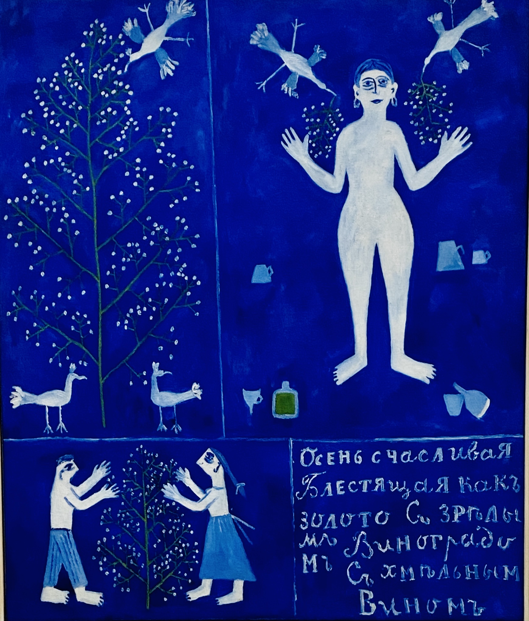 Example: Autumn (1912) by Mikhail Larionov at the Centre Pompidou: The bold use of color is striking. The use of blue, in particular, makes representational art stand out. Despite the lack of depth, the image conveys powerful movement through the birds and dynamic figures on the tree. The painterly style is evident in the sharp lines that define the figures’ boundaries.